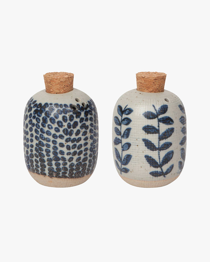 This sophisticated salt and pepper shaker set is perfect for a coordinated dinner table. Nature inspired designs and cork stoppers give these functional but elegant pieces a rustic feel. Finished with a reactive glaze, each piece is unique. There may be slight variations in color, texture, and finish to each perfectly imperfect item.