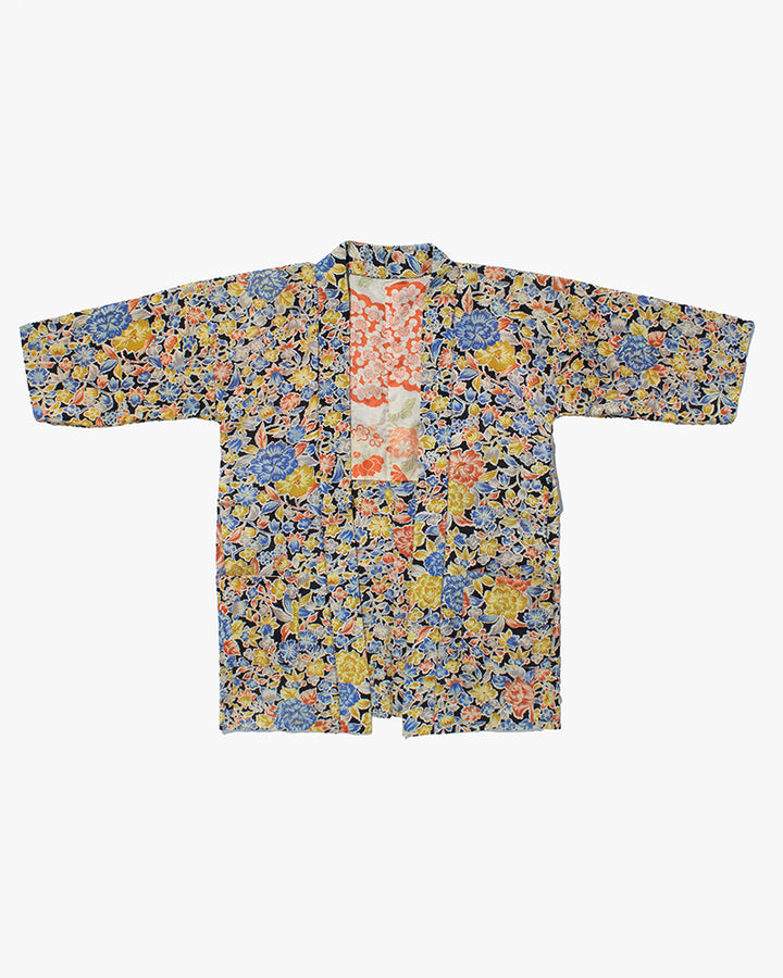 Kiriko Custom, Altered Kimono Jacket, Black with Multicolor Flowers and Embroidered Accents