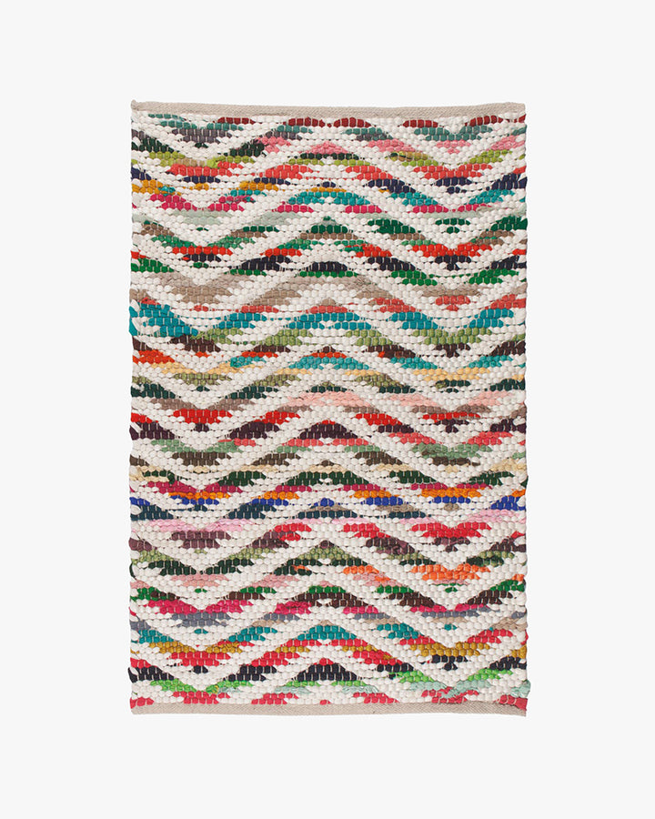 Authentically crafted in India using up-cycled cotton fabric scraps, these rugs add a colorful pop to any space in the home. The fabrics are chosen at random and woven by hand by skilled weavers. Each piece is unique.